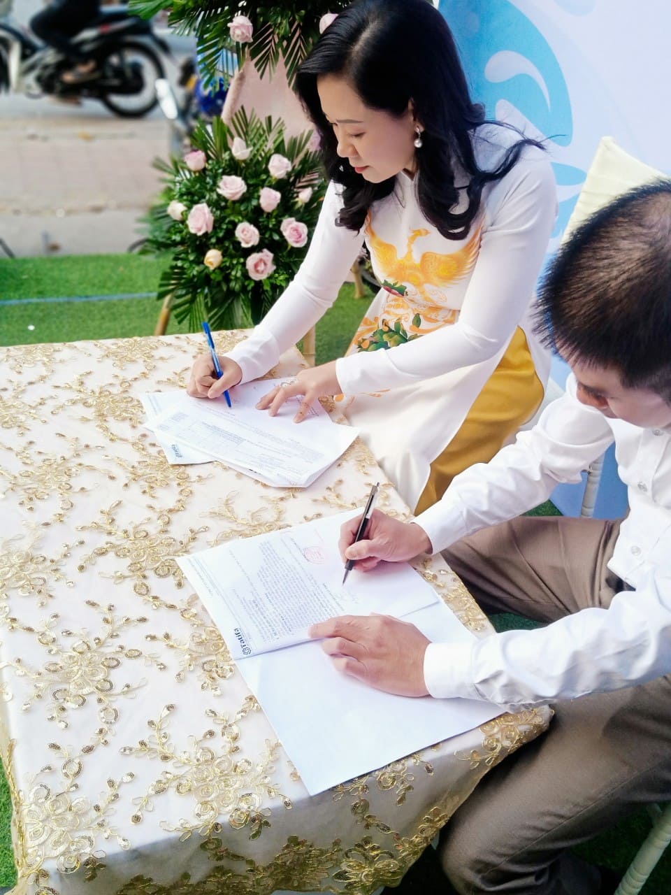 Bà Lê Diễm – đại diện kinh doanh của Công ty Cổ phần Tập đoàn Tân Tiến Phát và ông Nguyễn Xuân Hà – đại diện nhà phân phối Xuân Hà ký kết hợp đồng nhà phân phối tỉnh Thái Bình