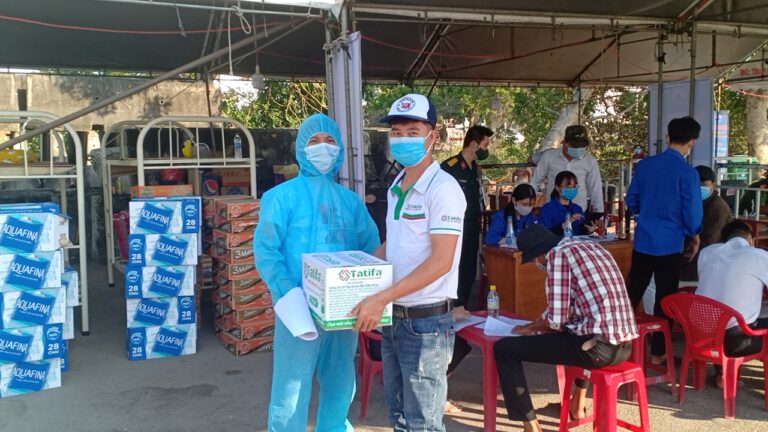 Công ty CP Tập đoàn Tân Tiến Phát Đà Nẵng phối hợp với TC Ánh sáng và Cuộc sống ủng hộ bào con vùng cách ly rau sạch, bánh, nước uống I-on kiềm.