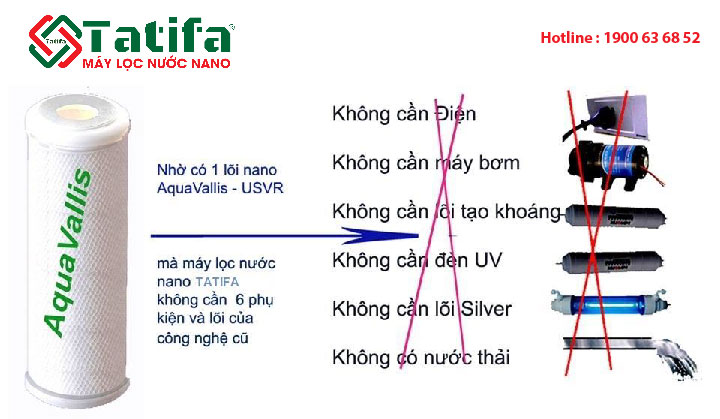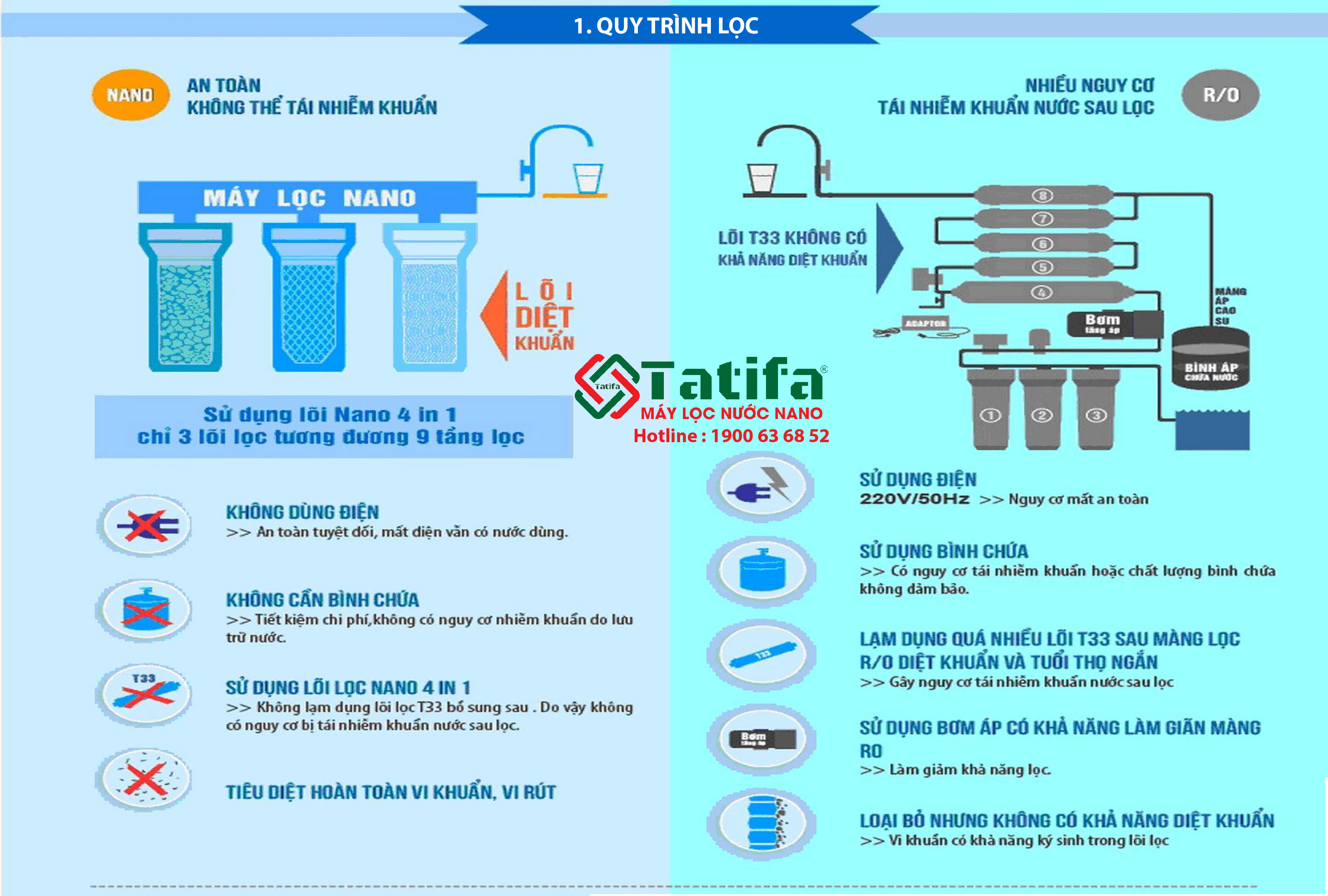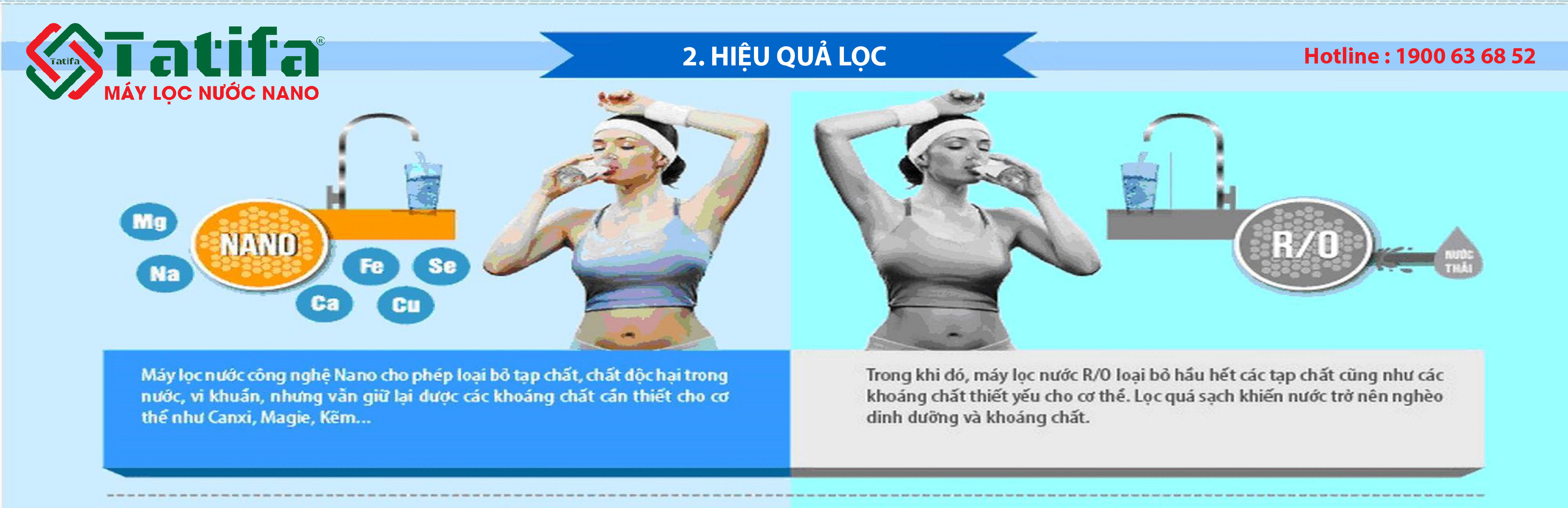 Máy lọc nước Nano : Lọc được các chất hòa tan trong nước nhưng vẫn giữ nguyên các khoáng chất và vi lượng tự nhiên cần thiết cho sức khỏe con người ==> Máy lọc nước Nano không cần đến lõi tạo khoáng, không tiêu hao điện năng cũng như nước thải.