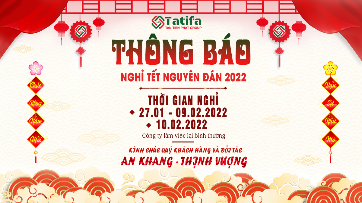 TATIFA xin trân trọng thông báo tới Quý đối tác và khách hàng: công ty sẽ nghỉ Tết Nguyên Đán 2022 từ ngày 27/01/2022 đến hết ngày 09/02/2022 và quay trở lại làm việc từ ngày 10/02/2022.