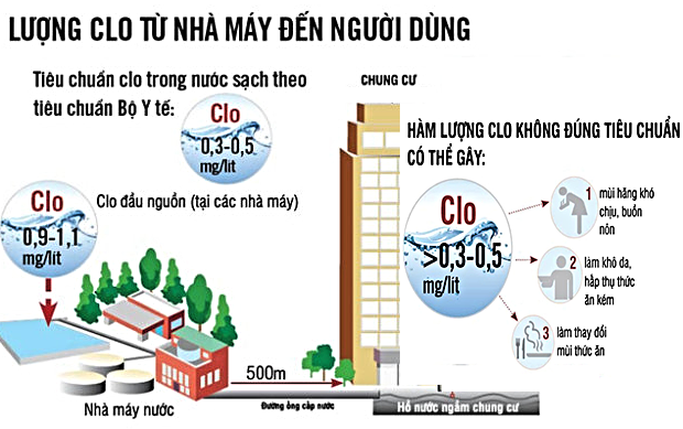Được đầu tư nguồn nước từ các nhà máy nước thành phố thông qua hệ thống xử lý nước bằng hệ thống nước lọc công nghiệp cấp đến cho các hộ gia đình ở các thành phố lớn, đô thị. Vì vậy nước máy thường có hàm lượng clo dư thừa cao khi đưa lên ngửi sẽ có mùi hăng gây ra hiện tượng khó chịu, buồn nôn, làm thay đổi mùi vị của thức ăn, ảnh hưởng đến việc hấp thụ thức ăn của con người.
